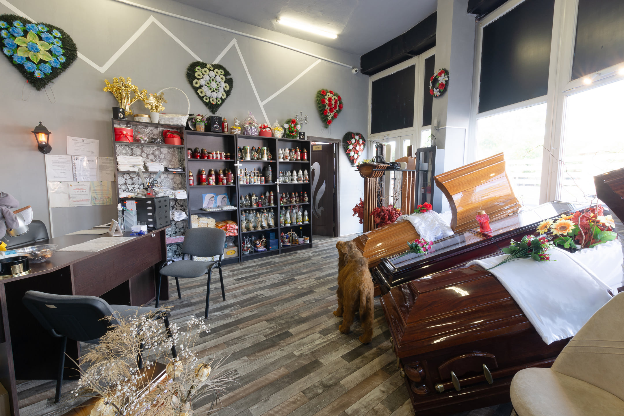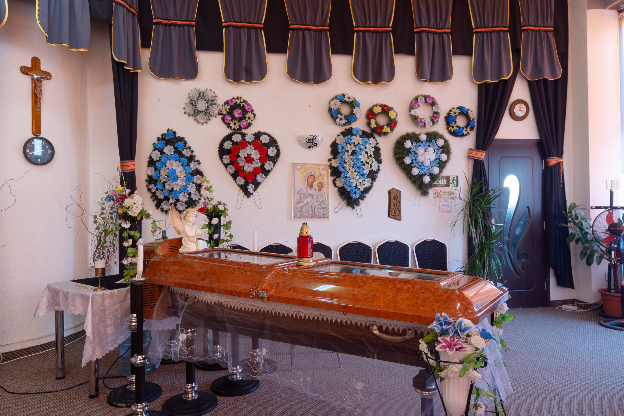 Mai multProdusele funerare pe care societatea noastră vi le pune la dispoziție sunt: sicrie de diverse mărimi, garnitură sicriu, cruce scrisă, coroane și aranjamente sicrie, batiste și prosoape, lumânări, etc..