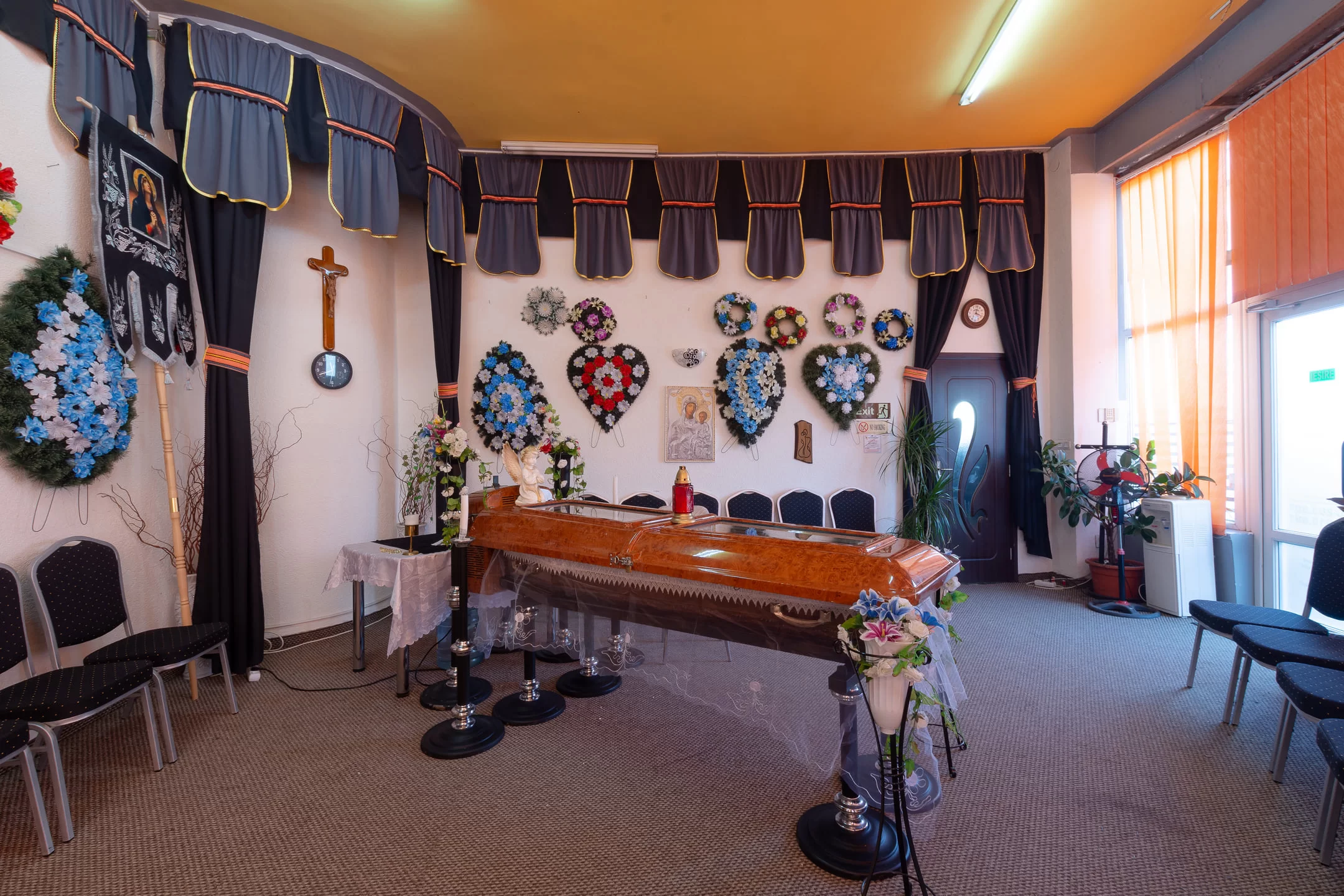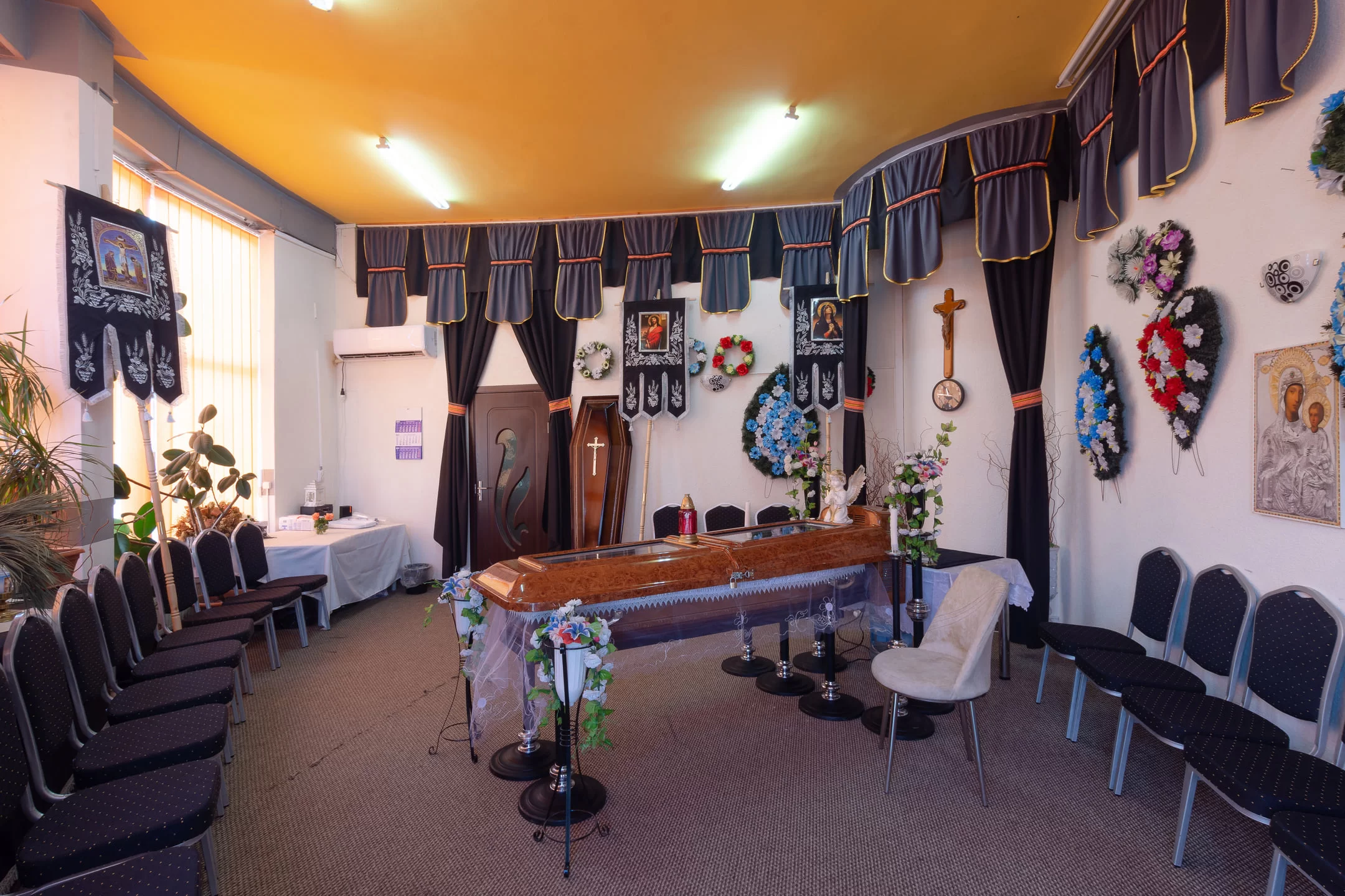 Suntem mândri să vă oferim o sală de priveghi special dedicată credincioșilor de toate religiile. Sala de priveghi, cu o capacitate de pana la 100 persoane, este dotată cu: sistem aer condiționat, sistem încălzire (în perioada rece), catafalc pentru poziționarea sicriului, capac frigorific sicriu, scaune pentru familie și cei apropiați, vaze pentru flori și suport pentru coroane, suporturi pentru lumânări aprinse.